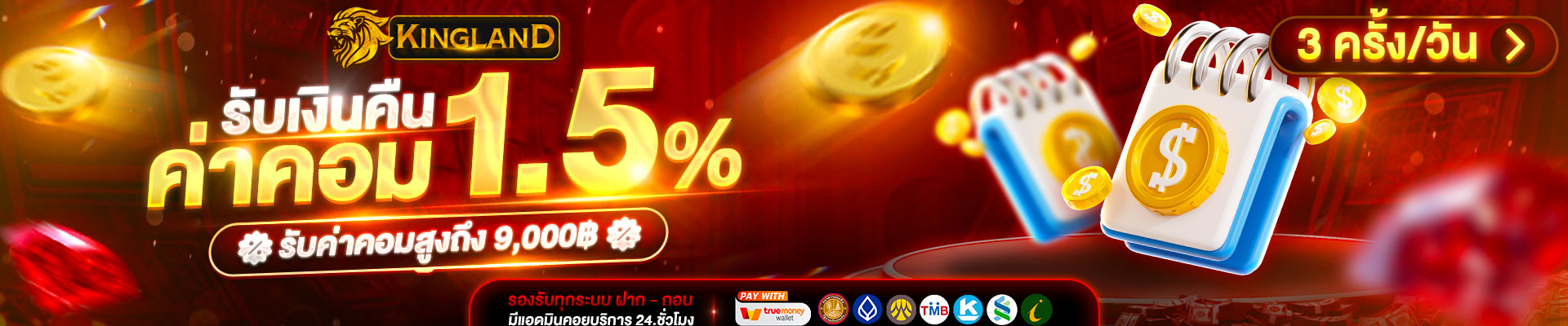 ล่าสุดในปี 2024 นี้ Kingland ได้เพิ่มโปรโมชั่นพิเศษสำหรับนักเดิมพันที่ชื่นชอบคาสิโนสด มีโบนัสเพิ่ม 50% สำหรับการเล่นเกมไพ่บาคาร่าและรูเล็ต ทุกการฝากตั้งแต่ 500 บาทขึ้นไป พร้อมเงื่อนไขทำเทิร์นที่เบาสบาย เพียง 3 เท่าเท่านั้น