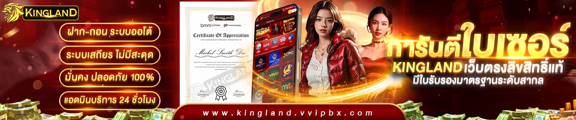 การันตีด้วยมาตรฐานระดับสากล ใบอนุญาตถูกต้อง และความมั่นคงทางการเงิน ผู้เล่นสามารถเข้าถึงบริการได้ตลอด 24 ชั่วโมง พร้อมทีมงานมืออาชีพคอยให้คำปรึกษาตลอดเวลา เว็บ Kingland เป็นจุดหมายของนักพนันที่ต้องการความสะดวกสบายและความบันเทิงในระดับพรีเมียม